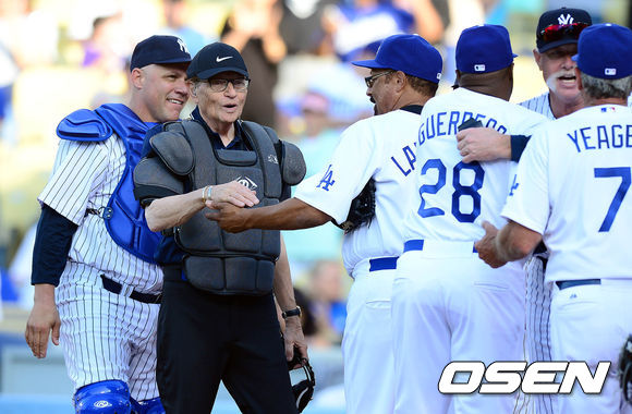 9일 오전(이하 한국시간) 미국 캘리포니아주 로스앤젤레스 다저스타디움에서 열린 LA 다저스와 애틀랜타 브레이브스의 경기 시작 전, '올드 타이머 게임'(Old Timers' Game)에서 주심으로 나선 래리 킹이 레전드 선수들과 인사를 나누고 있다.