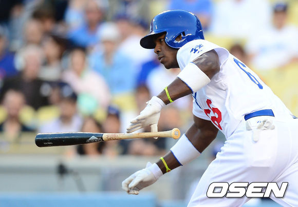 9일 오전(이하 한국시간) 미국 캘리포니아주 로스앤젤레스 다저스타디움에서 열린 LA 다저스와 애틀랜타 브레이브스의 경기 1회말 선두타자 푸이그가 기습번트를 치고 달리고 있다. 푸이그는 1루에서 아웃.