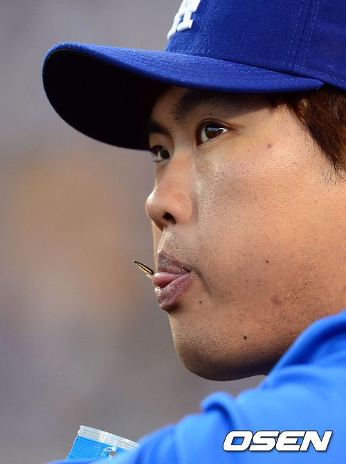 9일 오전(이하 한국시간) 미국 캘리포니아주 로스앤젤레스 다저스타디움에서 열린 LA 다저스와 애틀랜타 브레이브스의 경기 3회초 류현진이 덕아웃에서 경기를 지켜보고 있다.