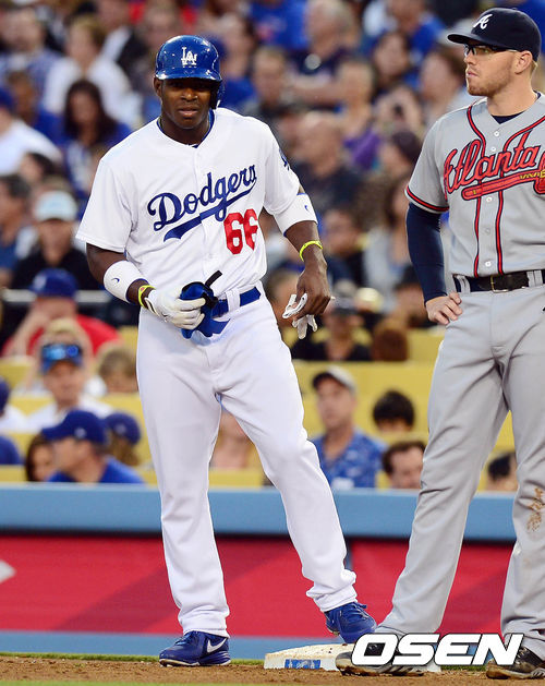 9일 오전(이하 한국시간) 미국 캘리포니아주 로스앤젤레스 다저스타디움에서 열린 LA 다저스와 애틀랜타 브레이브스의 경기 3회말 2사 푸이그가 우전안타를 치고 1루베이스에 서 있다.