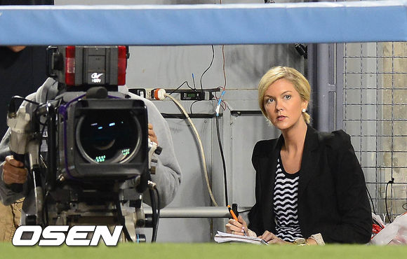 9일 오전(이하 한국시간) 미국 캘리포니아주 로스앤젤레스 다저스타디움에서 열린 LA 다저스와 애틀랜타 브레이브스의 경기, 아나운서가 경기를 지켜보고 있다.