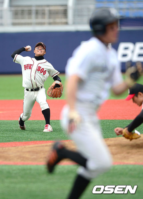 9일 오후 창원 마산구장에서 열린 '제67회 황금사자기 전국고교야구대회 겸 주말리그 왕중왕전' 덕수고와 마산고의 결승전 경기, 1회말 1사 2,3루 덕수고 2루수 김하민이 마산고 류승찬의 땅볼 타구를 잡아 홈으로 송구하고 있다.