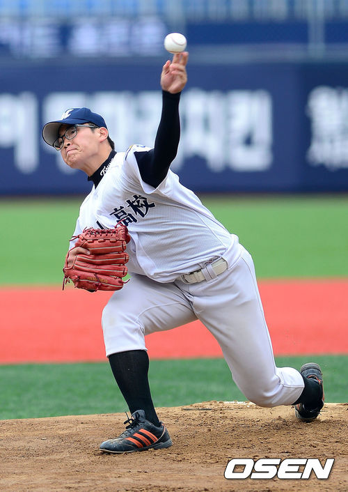 9일 오후 창원 마산구장에서 열린 '제67회 황금사자기 전국고교야구대회 겸 주말리그 왕중왕전' 덕수고와 마산고의 결승전 경기, 1회초 마산고 궁정홍이 역투하고 있다.