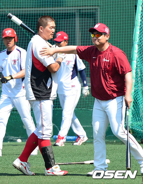 9일 오후 목동구장에서 열리는 '2013 한국야쿠르트 세븐 프로야구' 넥센 히어로즈 대 KIA 타이거즈의 경기를 앞두고 넥센 심재학 코치와 KIA 최희섭이 인사를 나누고 있다.