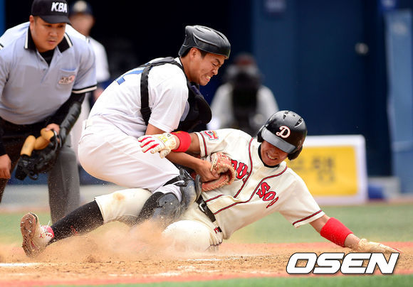 9일 오후 창원 마산구장에서 열린 '제67회 황금사자기 전국고교야구대회 겸 주말리그 왕중왕전' 덕수고와 마산고의 결승전 경기, 3회초 2사 1,3루 덕수고 임병욱 타석때 더블 스틸을 시도하던 3루 주자 김규동이 마산고 김민혁에게 태그아웃 당하고 있다.