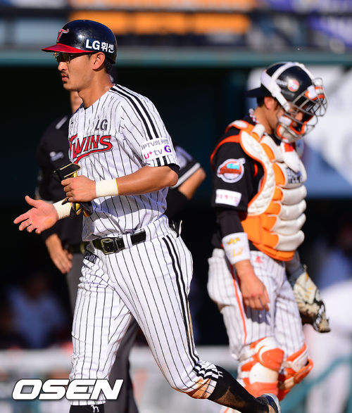 9일 오후 서울 잠실구장에서 열린 2013 한국야쿠르트 세븐 프로야구 LG 트윈스와 롯데 자이언츠의 경기, 1회말 2사 만루 LG 이진영의 밀어내기 볼넷때 3루 주자 박용택이 홈을 밟고 선취득점을 올리고 있다.