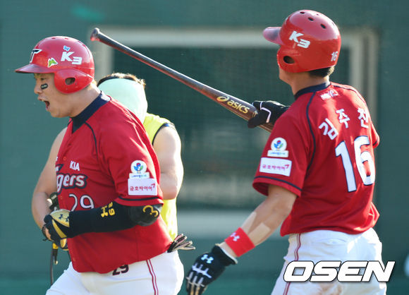 9일 오후 목동구장에서 열리는 '2013 한국야쿠르트 세븐 프로야구' 넥센 히어로즈 대 KIA 타이거즈의 경기가 열렸다. 3회초 KIA 공격 2사 2루 상황 4번 나지완이 중월 투런포를 날리고 김주찬과 인사를 나누고 있다.