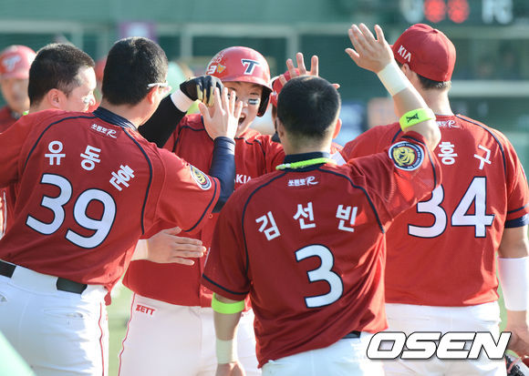 9일 오후 목동구장에서 열리는 '2013 한국야쿠르트 세븐 프로야구' 넥센 히어로즈 대 KIA 타이거즈의 경기가 열렸다. 3회초 KIA 공격 2사 2루 상황 4번 나지완이 중월 투런포를 날리고 더그아웃 동료들과 인사를 나누고 있다.