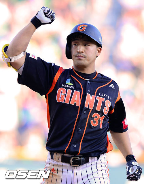 9일 오후 서울 잠실구장에서 열린 2013 한국야쿠르트 세븐 프로야구 LG 트윈스와 롯데 자이언츠의 경기, 4회초 2사 만루 롯데 손아섭이 2타점 적시타를 날리고 주먹을 쥐며 환호하고 있다
