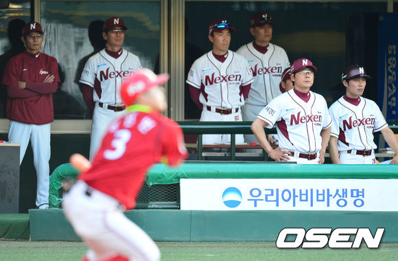 9일 오후 목동구장에서 열리는 '2013 한국야쿠르트 세븐 프로야구' 넥센 히어로즈 대 KIA 타이거즈의 경기가 열렸다. 6회초 KIA 공격 2사 2루 상황 2번 김선빈 타석 때 넥센 염경엽 감독과 이강철 코치를 비롯해 코칭스태프가 일어서서 경기를 지켜보고 있다.