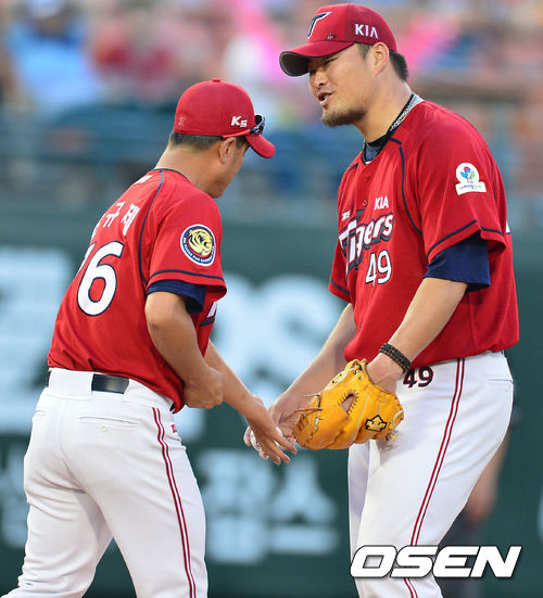 9일 오후 목동구장에서 열리는 '2013 한국야쿠르트 세븐 프로야구' 넥센 히어로즈 대 KIA 타이거즈의 경기가 열렸다. 8회말 넥센 공격 1사 2루 상황 KIA 선발 김진우가 마운드를 내려가며 조규제 코치에게 공을 건네고 있다.