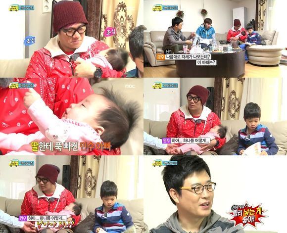 김성주 딸을 안고 한참을 달래주던 윤민수는 “하나를 더 낳아야 되나”라며 딸 욕심을 내비쳤고 김성주는 "빨리 낳아라"고 바람을 잡았다.