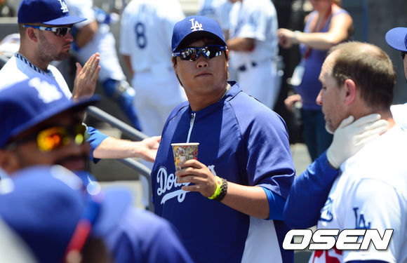 10일 새벽(이하 한국시간) 미국 캘리포니아주 로스앤젤레스 다저스타디움에서 열린 LA 다저스와 애틀랜타 브레이브스의 경기 시작 전 류현진이 덕아웃에서 관중석을 바라보고 있다.