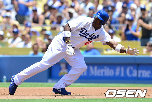 10일 새벽(이하 한국시간) 미국 캘리포니아주 로스앤젤레스 다저스타디움에서 열린 LA 다저스와 애틀랜타 브레이브스의 경기 1회말 선두타자 푸이그가 좌전안타를 치고 2루로 달리다 1루 베이스로 돌아가고 있다.