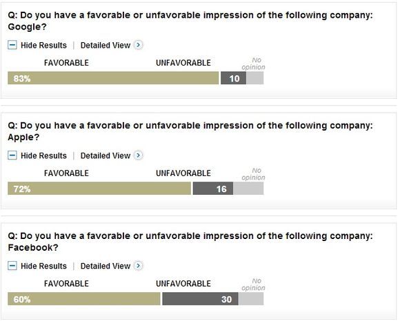 이 결과 구글이 83%의 표를 얻어 애플과 페이스북을 제치고 미국인이 가장 선호하는 IT 기업으로 선정됐다. 애플은 72%, 페이스북은 60%의 지지율로 각각 2위와 3위를 차지했다.