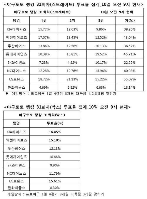 국민체육진흥공단(www.kspo.or.kr)이 발행하는 체육진흥투표권 수탁사업자인 스포츠토토 공식발매사이트인 베트맨(www.betman.co.kr)은 11일(화)에 개최되는 두산-SK, 한화-LG, KIA-NC, 롯데-넥센 등 4경기 8개팀을 대상으로 한 야구토토 랭킹 31회차 스트레이트 게임 중간집계결과 LG(55.07%), 롯데(45.71%), 넥센(43.04%)을 차례로 다득점 상위 3개팀으로 꼽았다고 밝혔다. 반면 SK(22.22%), 한화(18.14%)는 가장 적은 득점을 기록할 것으로 예상했다.