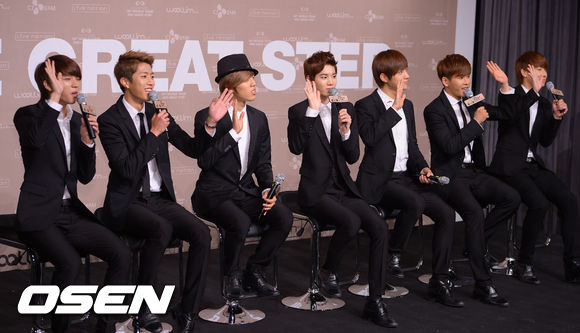 10일 오후 서울 청담동 청담 CGV에서 진행된 그룹 인피니트 첫번째 월드투어 'ONE GREAT STEP' 기자회견에서 인피니트가 팬들에게 인사를 하고 있다
