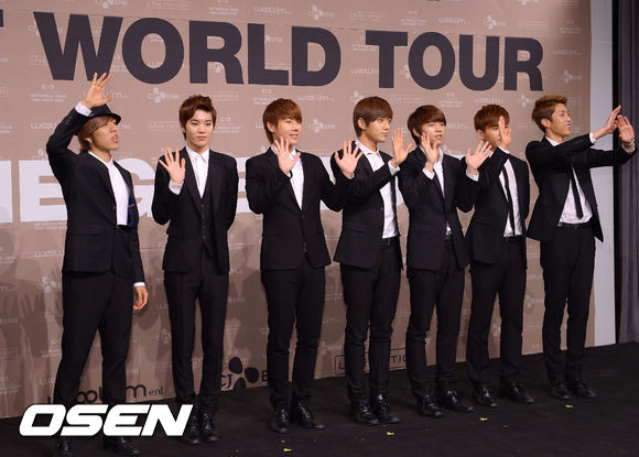 10일 오후 서울 청담동 청담 CGV에서 진행된 그룹 인피니트 첫번째 월드투어 'ONE GREAT STEP' 기자회견에서 인피니트가 팬들에게 인사를 하고 있다