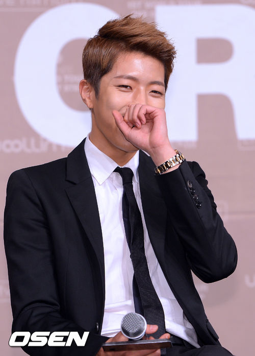 10일 오후 서울 청담동 청담 CGV에서 진행된 그룹 인피니트 첫번째 월드투어 'ONE GREAT STEP' 기자회견에서 인피니트 성열이 웃음을 참고 있다