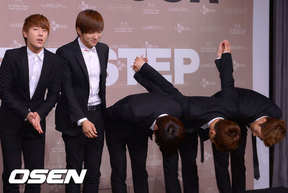10일 오후 서울 청담동 청담 CGV에서 진행된 그룹 인피니트 첫번째 월드투어 'ONE GREAT STEP' 기자회견에서 인피니트가 인사를 하고 있다