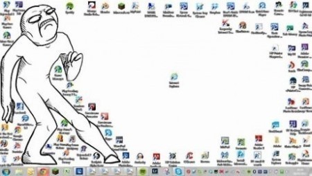 화제가 된 최고 어지러운 바탕화면에는 수많은 아이콘들이 인상을 찌푸리고 있는 사람 주변으로 정신없이 배치되어 있다.