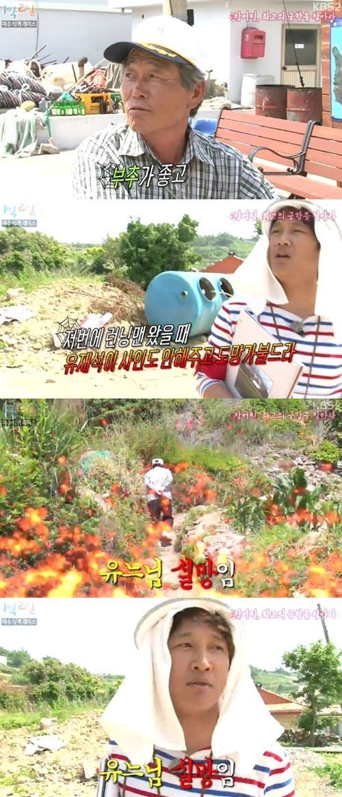 국민 MC 유재석에 대한 언급은 지난 9일 KBS 2TV 주말버라이어티 ‘해피선데이-1박2일’ 여수 식객 레이스의 두 번째 편에서 비롯됐다. 이날 방송에 나온 동네 이장님이 1박 2일 유재석 언급에 아쉬움을 토로한 것.