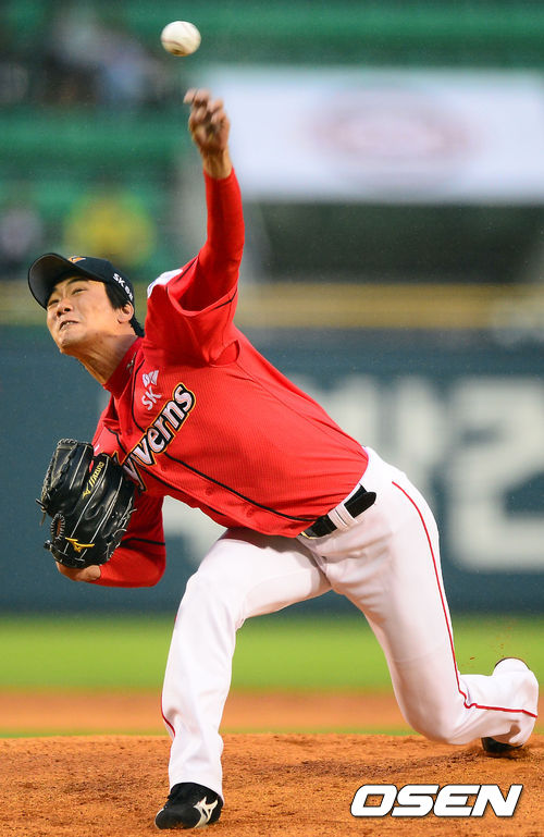 11일 오후 서울 잠실구장에서 열린 2013 한국야쿠르트 세븐프로야구 두산 베어스와 SK 와이번스의 경기, SK 선발 김광현이 힘차게 공을 뿌리고 있다.