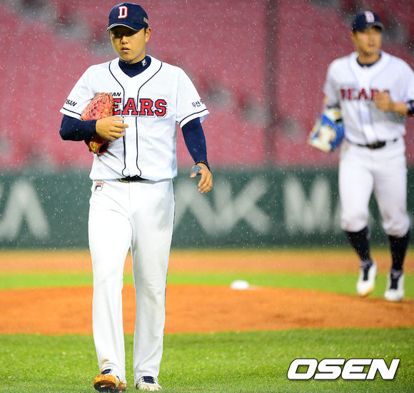 11일 오후 서울 잠실구장에서 열린 2013 한국야쿠르트 세븐프로야구 두산 베어스와 SK 와이번스의 경기, 3회초 우천으로 경기가 잠시 중단되며 두산 선발 이정호가 덕아웃으로 들어오고 있다.