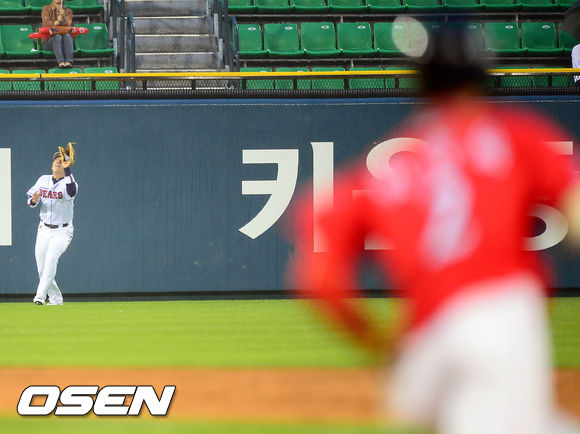 11일 오후 서울 잠실구장에서 열린 2013 한국야쿠르트 세븐프로야구 두산 베어스와 SK 와이번스의 경기, 3회초 SK 박승욱의 타구를 두산 좌익수 김현수가 잡아내고 있다.