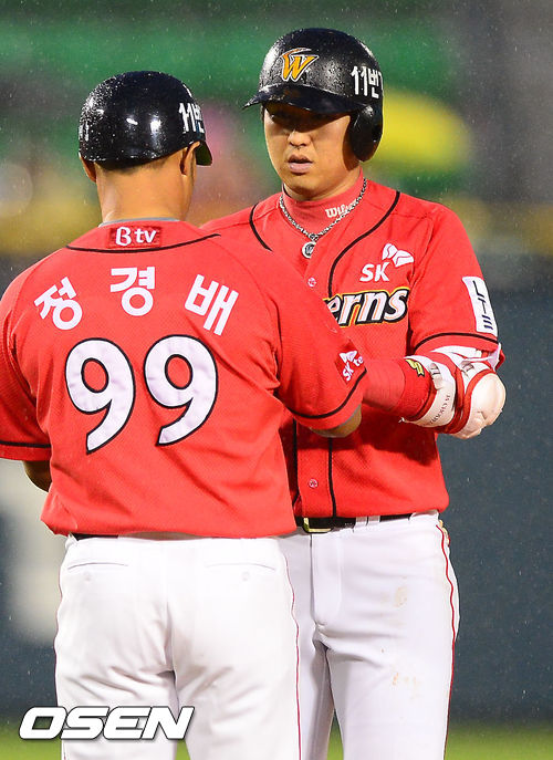 11일 오후 서울 잠실구장에서 열린 2013 한국야쿠르트 세븐프로야구 두산 베어스와 SK 와이번스의 경기, 4회초 무사 주자 1루 SK 최정이 중견수 오른쪽 2루타를 날린 후 2루에서 정경배 코치와 하이파이브를 하고 있다. 이 2루타는 두산 이종욱이 잡아내지 못했다.