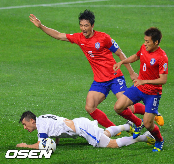 11일 오후 서울월드컵경기장에서 열린 '2014 브라질월드컵 아시아 최종예선 A조 7차전' 한국과 우즈베키스탄의 경기, 전반 곽태휘가 제파로프를 상대로 수비를 펼치고 있다.