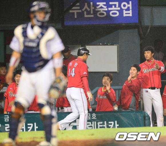 11일 오후 서울 잠실구장에서 열린 2013 한국야쿠르트 세븐프로야구 두산 베어스와 SK 와이번스의 경기, 4회초 1사 주자 2,3루 SK 김상현의 2루수 땅볼때 홈을 밟은 최정이 덕아웃에서 동료들과 하이파이브를 하고 있다.