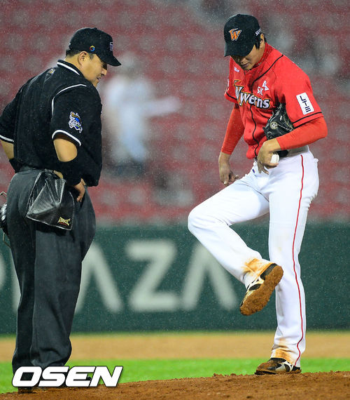 11일 오후 서울 잠실구장에서 열린 2013 한국야쿠르트 세븐프로야구 두산 베어스와 SK 와이번스의 경기, 4회말 피칭을 하던 SK 선발 김광현이 최수원 구심과 얘기를 나누고 있다.