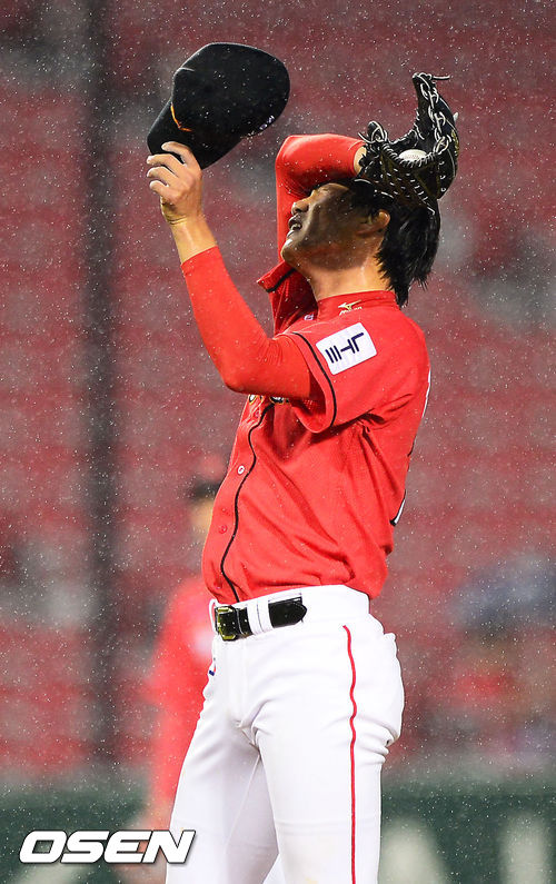11일 오후 서울 잠실구장에서 열린 2013 한국야쿠르트 세븐프로야구 두산 베어스와 SK 와이번스의 경기, 4회말 SK 김광현이 빗물과 땀을 닦고 있다.