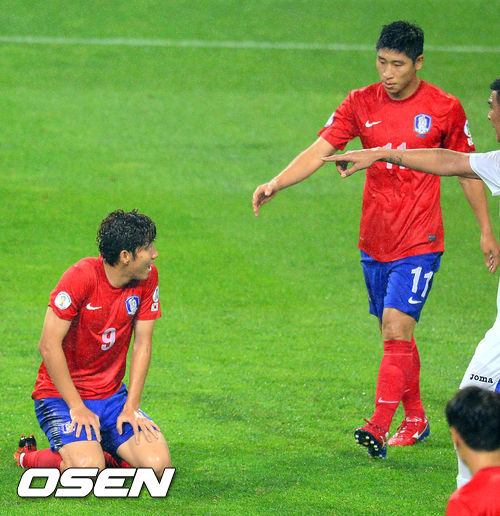 11일 오후 서울월드컵경기장에서 열린 '2014 브라질월드컵 아시아 최종예선 A조 7차전' 한국과 우즈베키스탄의 경기, 전반 이근호가 슛찬스를 놓친 손흥민을 격려하고 있다