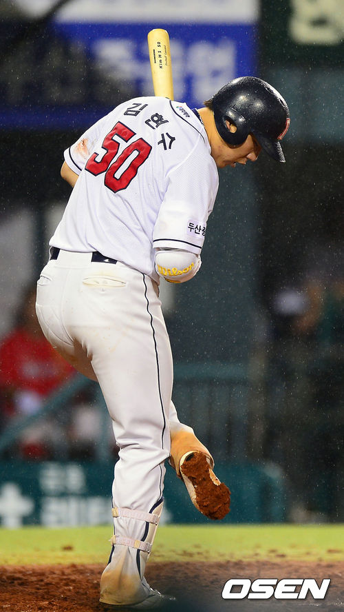 11일 오후 서울 잠실구장에서 열린 2013 한국야쿠르트 세븐프로야구 두산 베어스와 SK 와이번스의 경기, 4회말 2사 주자 3루 두산 김현수가 타석에서 자신의 스파이크를 바라보고 있다.