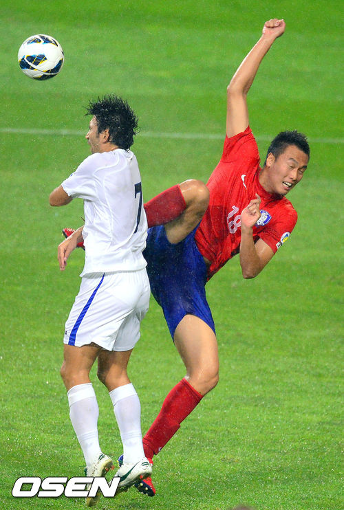 11일 오후 서울월드컵경기장에서 열린 '2014 브라질월드컵 아시아 최종예선 A조 7차전' 한국과 우즈베키스탄의 경기, 전반 김신욱이 발을 높이 들어 슛을 시도하고 있다