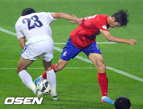 11일 오후 서울월드컵경기장에서 열린 '2014 브라질월드컵 아시아 최종예선 A조 7차전' 한국과 우즈베키스탄의 경기, 전반 이청용이 우즈벡 수비의 발에 걸려 공을 놓치고 있다