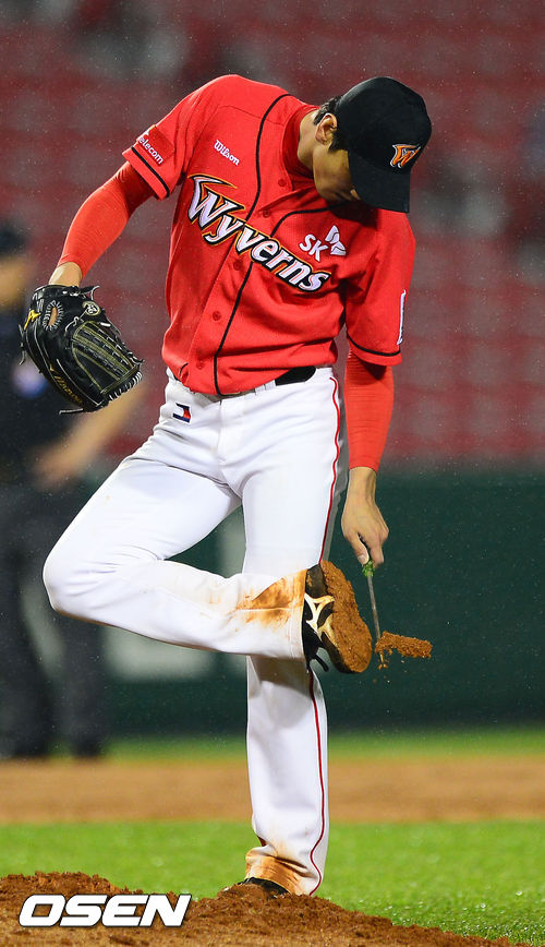 11일 오후 서울 잠실구장에서 열린 2013 한국야쿠르트 세븐프로야구 두산 베어스와 SK 와이번스의 경기, 5회말 마운드에 오른 SK 선발 김광현이 송곳같은 것으로 스파이크의 젖은 흙을 제거하고 있다.