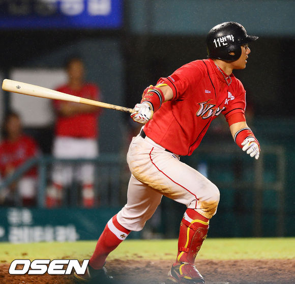 11일 오후 서울 잠실구장에서 열린 2013 한국야쿠르트 세븐프로야구 두산 베어스와 SK 와이번스의 경기, 5회초 2사 주자 1,3루 SK 박정권이 좌익수 앞 1타점 적시타를 날리고 있다.