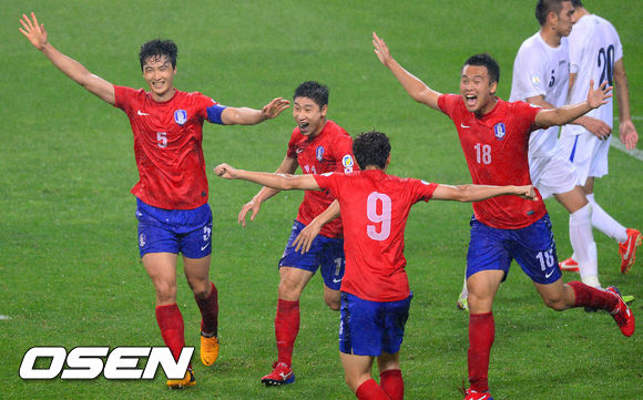 11일 오후 서울월드컵경기장에서 열린 '2014 브라질월드컵 아시아 최종예선 A조 7차전' 한국과 우즈베키스탄의 경기, 전반 우즈벡의 자책골에 한국대표팀 선수들이 환호하고 있다