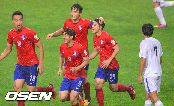 11일 오후 서울월드컵경기장에서 열린 '2014 브라질월드컵 아시아 최종예선 A조 7차전' 한국과 우즈베키스탄의 경기, 전반 우즈벡의 자책골에 축구대표팀 선수들이 환호하고 있다.