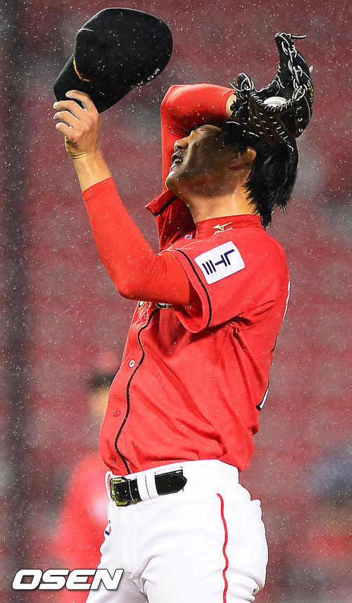 11일 오후 서울 잠실구장에서 열린 2013 한국야쿠르트 세븐프로야구 두산 베어스와 SK 와이번스의 경기, 4회말 SK 김광현이 빗물과 땀을 닦고 있다.