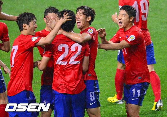 11일 오후 서울월드컵경기장에서 열린 '2014 브라질월드컵 아시아 최종예선 A조 7차전' 한국과 우즈베키스탄의 경기, 전반 우즈벡의 자책골때 축구대표팀 선수들이 프리킥을 올린 김영권에게 칭찬하고 있다