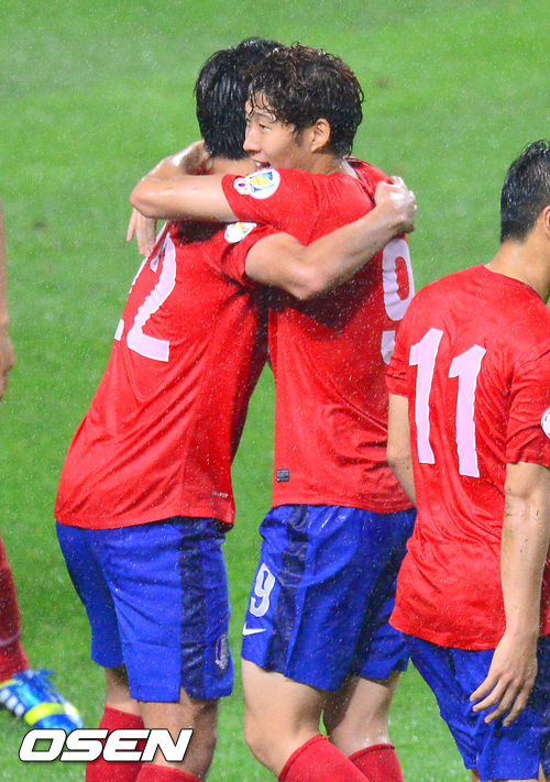 11일 오후 서울월드컵경기장에서 열린 '2014 브라질월드컵 아시아 최종예선 A조 7차전' 한국과 우즈베키스탄의 경기, 전반 우즈벡의 자책골때 축구대표팀 선수들이 기쁨을 나누고 있다