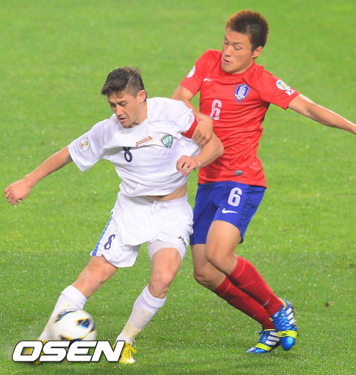 11일 오후 서울월드컵경기장에서 열린 '2014 브라질월드컵 아시아 최종예선 A조 7차전' 한국과 우즈베키스탄의 경기, 후반 이명주가 우즈벡 제파로프를 막고 있다