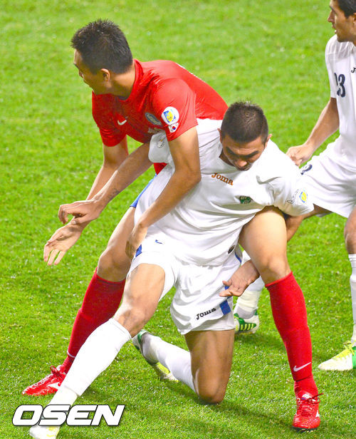11일 오후 서울월드컵경기장에서 열린 '2014 브라질월드컵 아시아 최종예선 A조 7차전' 한국과 우즈베키스탄의 경기, 후반 김신욱이 우즈벡 수비수의 손에 걸려 넘어지고 있다