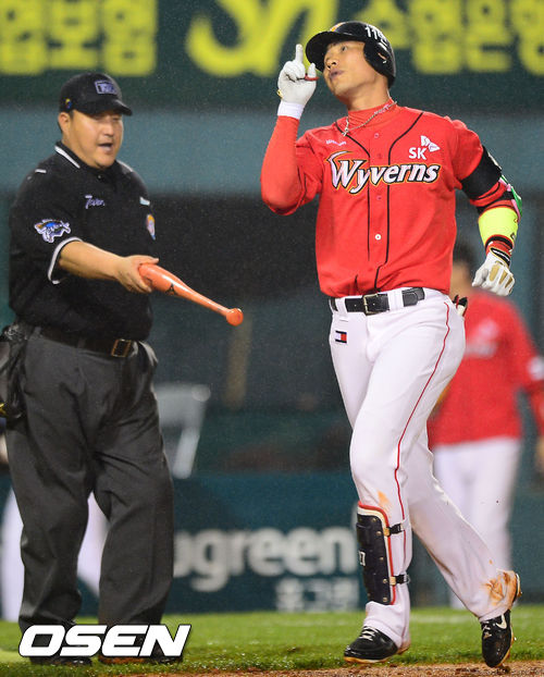 11일 오후 서울 잠실구장에서 열린 2013 한국야쿠르트 세븐프로야구 두산 베어스와 SK 와이번스의 경기, 8회초 선두타자 SK 김상현이 좌월 솔로홈런을 날린 후 그라운드를 돌며 세레모니를 할때 최수원 주심이 배트를 주려했지만 실패하고 있다.