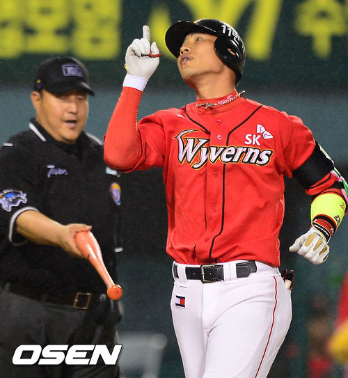 11일 오후 서울 잠실구장에서 열린 2013 한국야쿠르트 세븐프로야구 두산 베어스와 SK 와이번스의 경기, 8회초 선두타자 SK 김상현이 좌월 솔로홈런을 날린 후 그라운드를 돌며 세레모니를 할때 최수원 주심이 배트를 주려했지만 실패하고 있다.