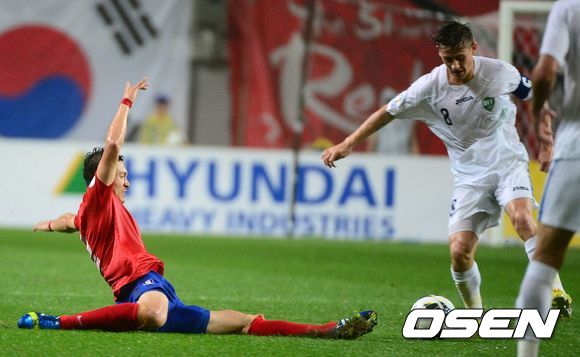 11일 오후 서울월드컵경기장에서 열린 '2014 브라질월드컵 아시아 최종예선 A조 7차전' 한국과 우즈베키스탄의 경기, 후반 박종우가 제파로프에 태클을 들어가고 있다